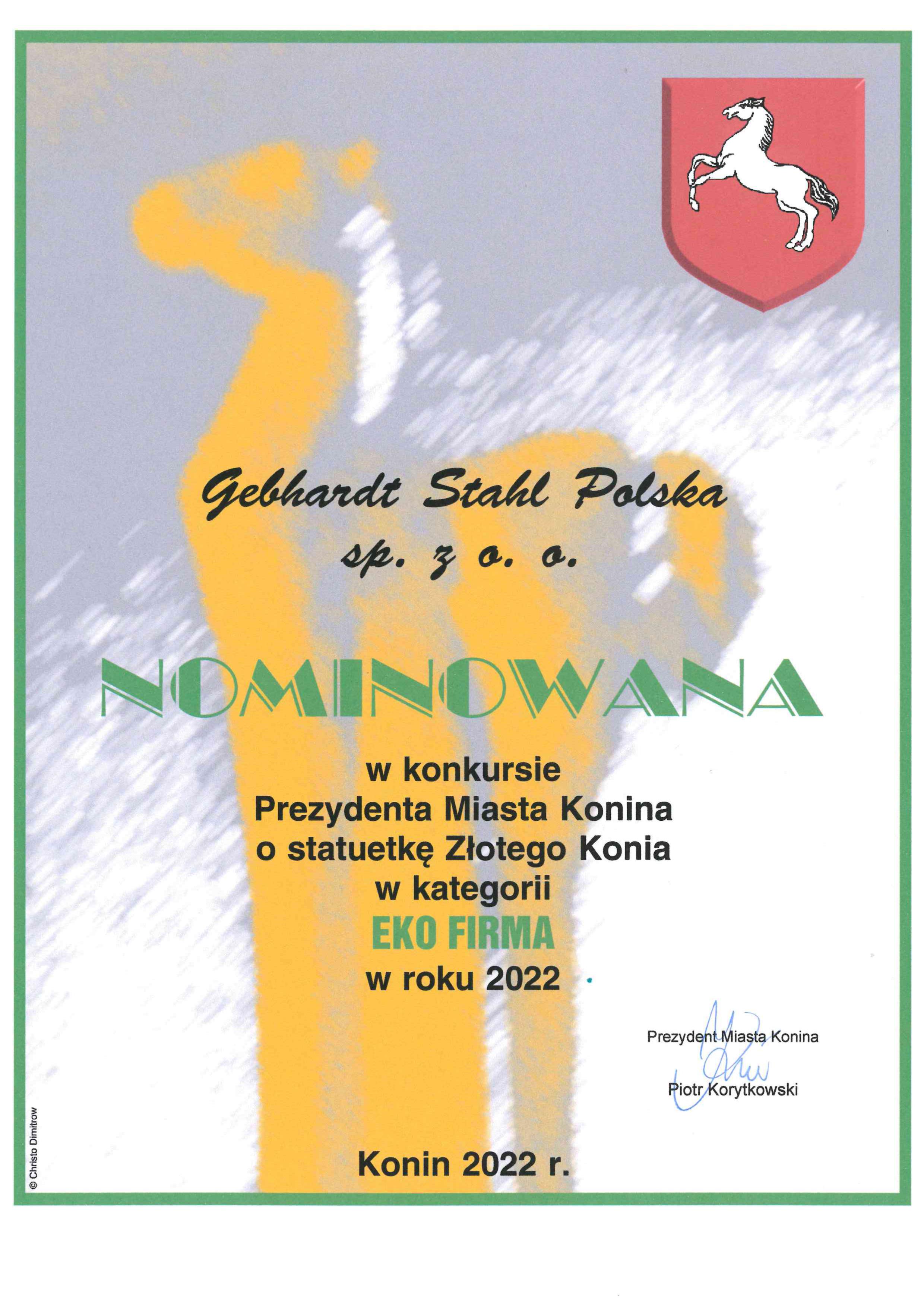 Po raz 25 konińskie firmy zostały uhonorowane Statuetką Złotego Konia. Nominowanych i nagrodzonych w tym konkursie wskazała kapituła, a wyniki ogłoszono podczas Gali Biznesu (9 września). Firmy oceniane były w czterech kategoriach: Firma Wspierająca Lokalną Społeczność, Eko Firma, Nowy Przedsiębiorca oraz Firma Roku. Kategoria Eko-Firma - skierowana do podmiotów, dla których ważne są działania proekologiczne ze szczególnym uwzględnieniem rozwiązań OZE – nominowane były trzy firmy: ArtDOM Serwis Michał Mielczarski, Contipack, Gebhardt Stahl Polska. Serdecznie gratulujemy firmie Grebhardt Stahl otrzymanej nominacji. Życzymy dalszych sukcesów i poczucia satysfakcji z wykonywanej pracy.